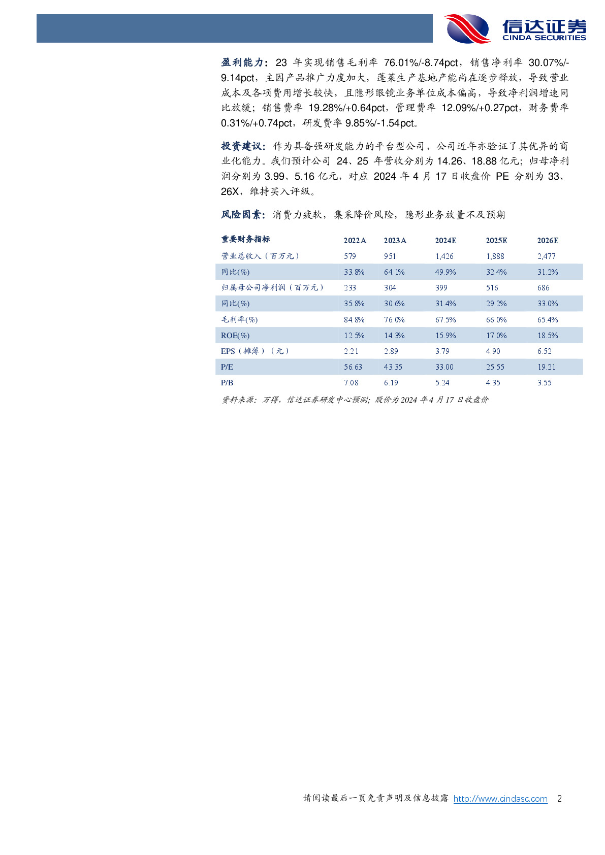 点评:一季报收入利润高增,隐形眼镜业务放量,玻尿酸进入临床