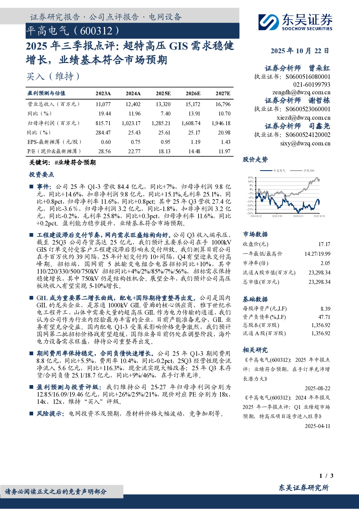 平高电气(600312)投资要点事件:公司25年Q1-3营收84.4亿元,同比+7%,归母净利润9.8亿元,同比+14.6%,扣非净利润9.8亿元,同比+15.1%,毛利率25.1%,同比+0.8pct,归母净利率11.6%,同比+0.8pct;其中25年Q3营收27.4亿元,同比-3.6%,归母净利润3.2亿元,同比-1.8%,扣非净利润3.2亿元,同比-0.2%,毛利率25.8%,同比+0.3