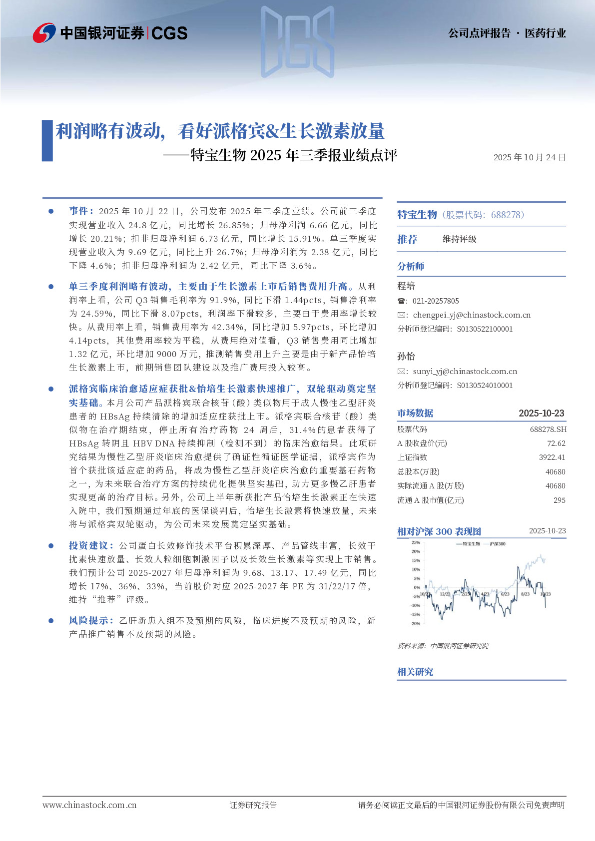 特宝生物2025年三季报业绩点评:利润略有波动,看好派格宾&生长激素放量