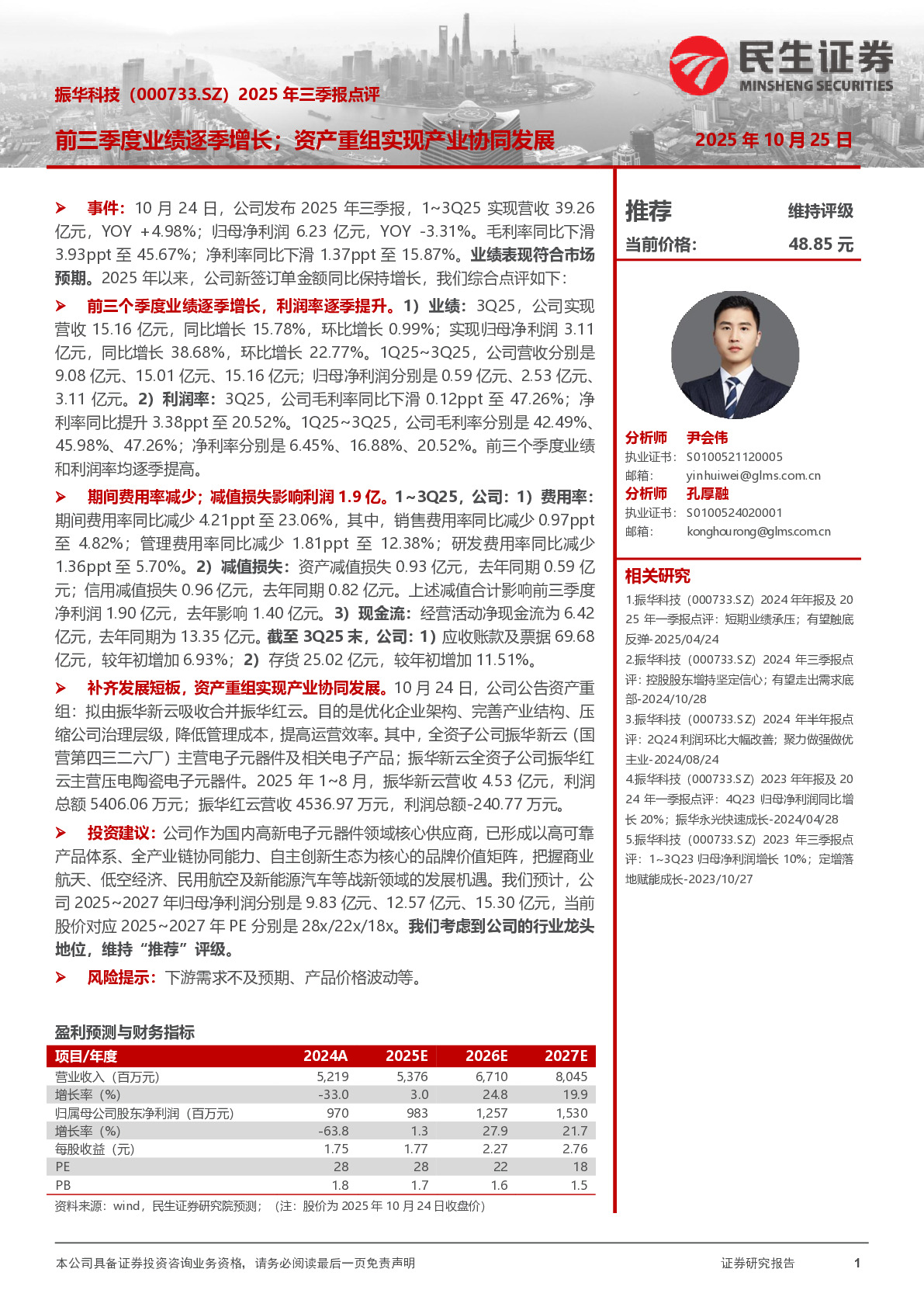 振华科技(000733)事件:10月24日,公司发布2025年三季报,1~3Q25实现营收39.26亿元,YOY+4.98%;归母净利润6.23亿元,YOY-3.31%。毛利率同比下滑3.93ppt至45.67%;净利率同比下滑1.37ppt至15.87%。业绩表现符合市场预期。2025年以来,公司新签订单金额同比保持增长,我们综合点评如下:前三个季度业绩逐季增长,利润率逐季