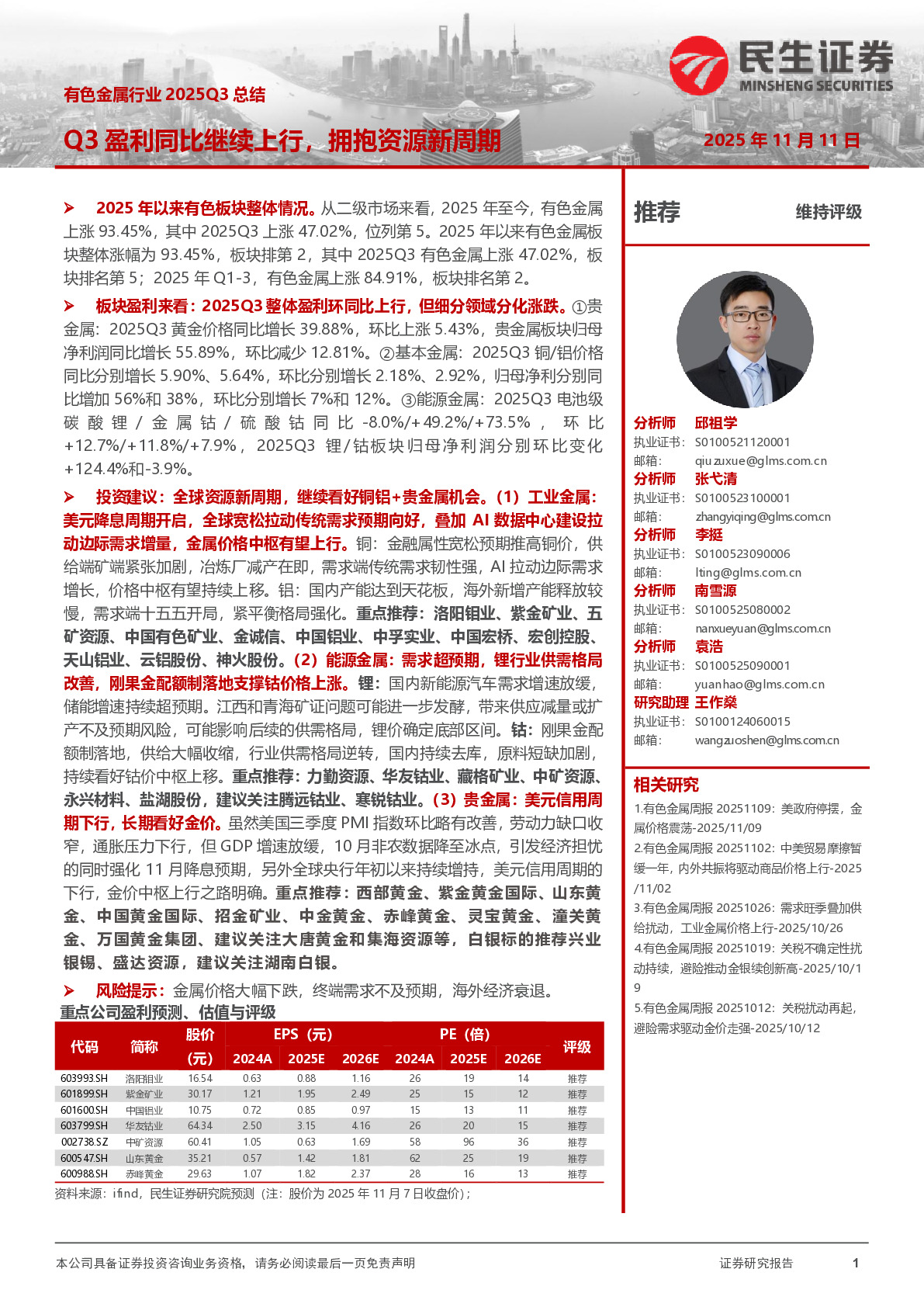 有色金属行业2025Q3总结:Q3盈利同比继续上行,拥抱资源新周期