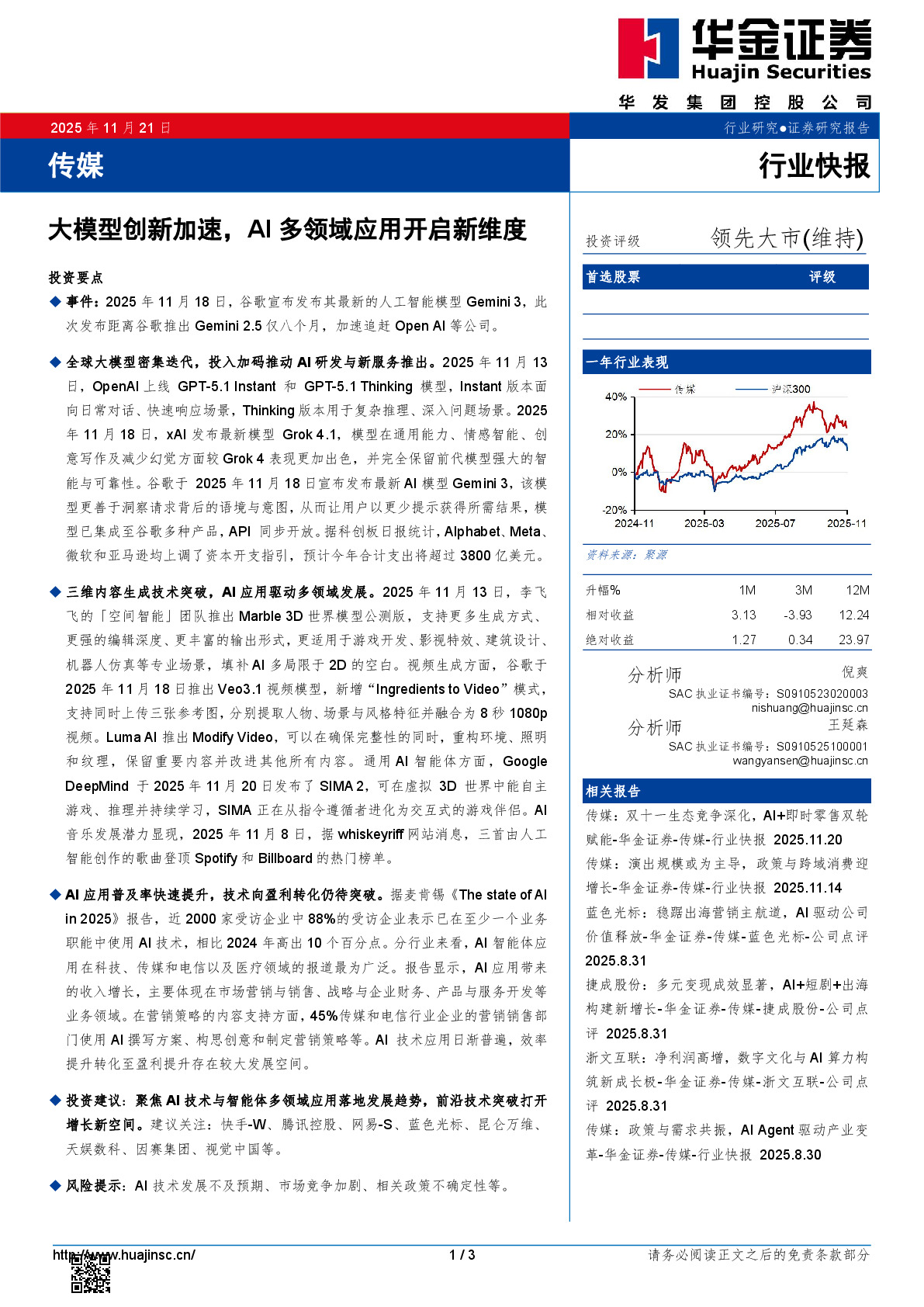投资要点事件:2025年11月18日,谷歌宣布发布其最新的人工智能模型Gemini3,此次发布距离谷歌推出Gemini2.5仅八个月,加速追赶OpenAI等公司。全球大模型密集迭代,投入加码推动AI研发与新服务推出。2025年11月13日,OpenAI上线GPT-5.1Instant和GPT-5.1Thinking模型,Instant版本面向日常对话、快速响应场景,Thinking版本用