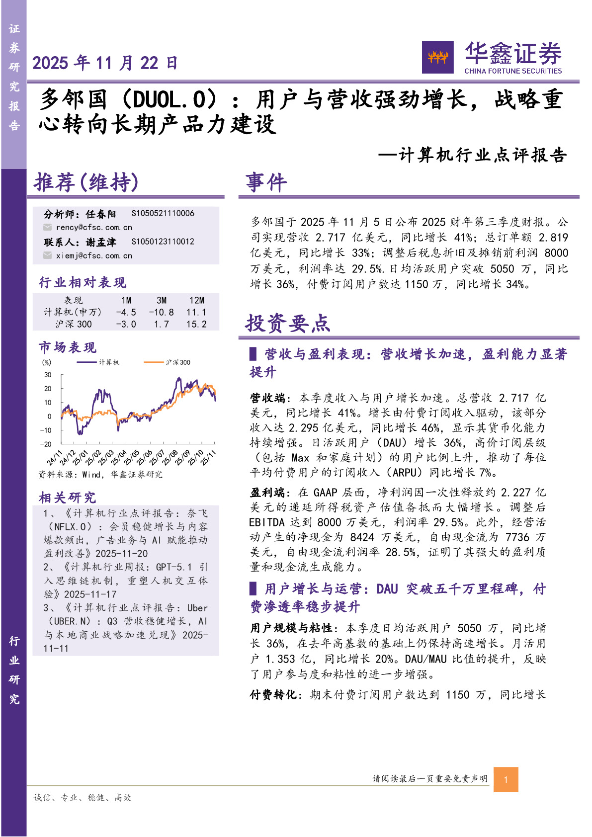 事件多邻国于2025年11月5日公布2025财年第三季度财报。公司实现营收2.717亿美元,同比增长41%;总订单额2.819亿美元,同比增长33%;调整后税息折旧及摊销前利润8000万美元,利润率达29.5%.日均活跃用户突破5050万,同比增长36%,付费订阅用户数达1150万,同比增长34%。投资要点营收与盈利表现:营收增长加速,盈利能力显著