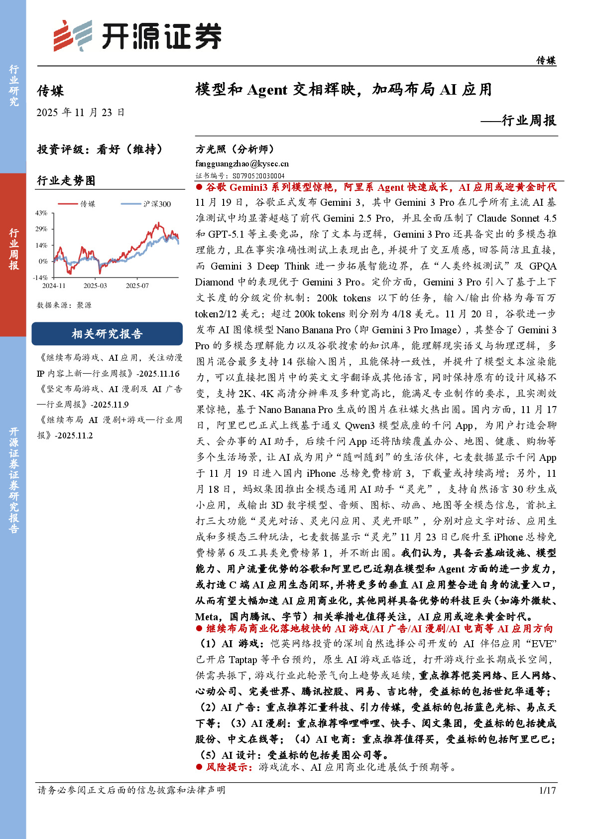 谷歌Gemini3系列模型惊艳,阿里系Agent快速成长,AI应用或迎黄金时代11月19日,谷歌正式发布Gemini3,其中Gemini3Pro在几乎所有主流AI基准测试中均显著超越了前代Gemini2.5Pro,并且全面压制了ClaudeSonnet4.5和GPT-5.1等主要竞品,除了文本与逻辑,Gemini3Pro还具备突出的多模态推理能力,且在事实准确性测试上表现出色,