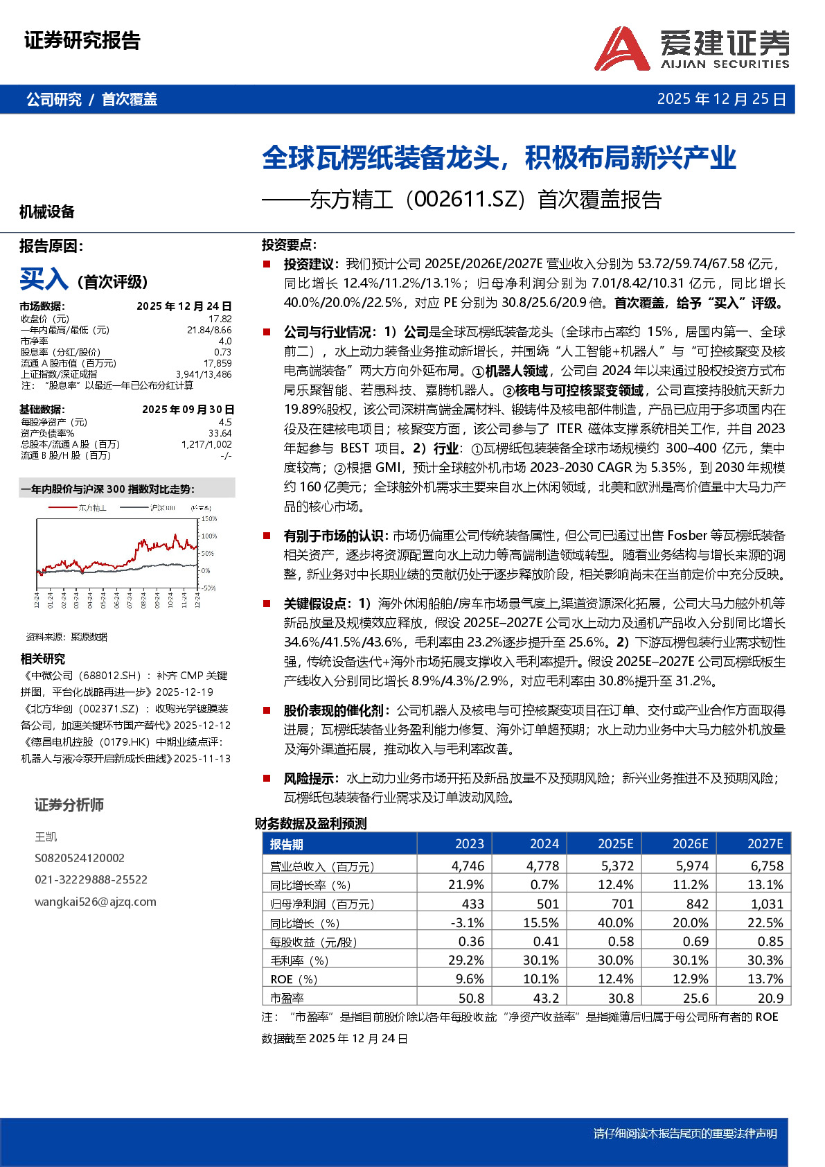 东方精工(002611)投资要点:投资建议:我们预计公司2025E/2026E/2027E营业收入分别为53.72/59.74/67.58亿元,同比增长12.4%/11.2%/13.1%;归母净利润分别为7.01/8.42/10.31亿元,同比增长40.0%/20.0%/22.5%,对应PE分别为30.8/25.6/20.9倍。首次覆盖,给予“买入”评级。公司与行业情况:1)公司是全球瓦楞纸装备龙头(全球