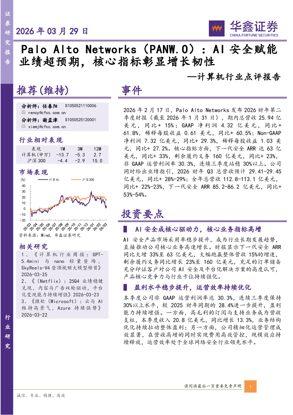 计算机行业点评报告:Palo Alto Networks:AI安全赋能业绩超预期,核心指标彰显增长韧性