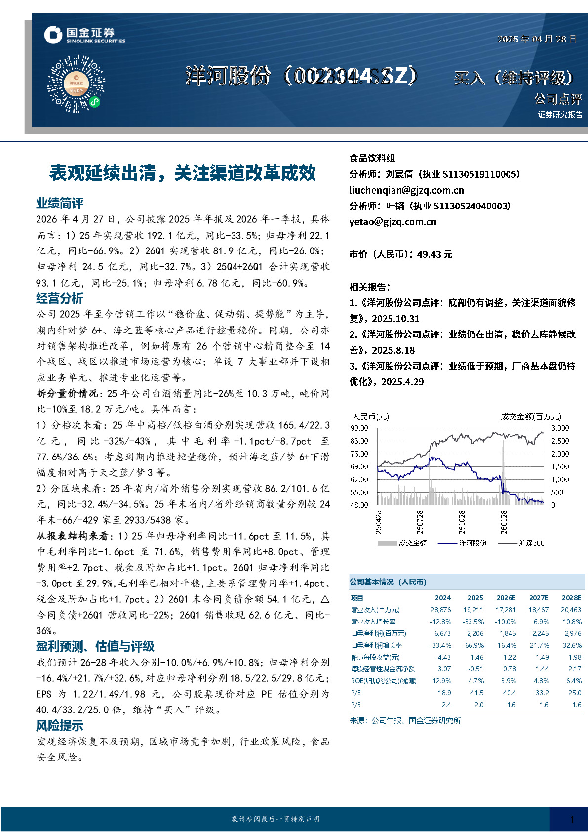 洋河股份(002304)业绩简评2026年4月27日,公司披露2025年年报及2026年一季报,具体而言:1)25年实现营收192.1亿元,同比-33.5%;归母净利22.1亿元,同比-66.9%。2)26Q1实现营收81.9亿元,同比-26.0%;归母净利24.5亿元,同比-32.7%。3)25Q4+26Q1合计实现营收93.1亿元,同比-25.1%;归母净利6.78亿元,同比-60.9%。经营分