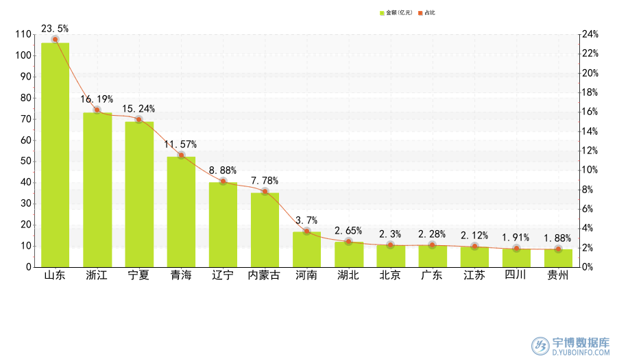 "宇博产业研究院"数据统计显示,基础化工行业营业利润TOP20A股上市公司中注册地在山东的企业营业利润总额高达105.93亿元,占比为23.5%。其次是浙江和宁夏地区,上榜企业的营业利润总额分别为72.97亿元和68.7亿元,占比分别为16.19%,15.24%。青海、辽宁、内蒙古、河南、湖北、北京、广东、江苏、四川、贵州等地上榜企业的营业利润总额合计为203.11亿元,占比为45.07%。
