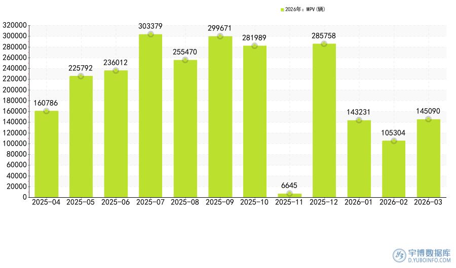 据报告网监测数据显示,2026年3国内MPV销量为145090辆,环比上涨了37.78%,销量增加了39786辆。